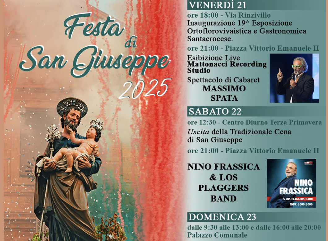 Anche quest’anno, Santa Croce Camerina si prepara a celebrare il suo Santo Patrono, San Giuseppe, con un ricco programma di eventi che uniscono tradizione e fede accompagnati da momenti di spettacolo e di promozione del territorio.