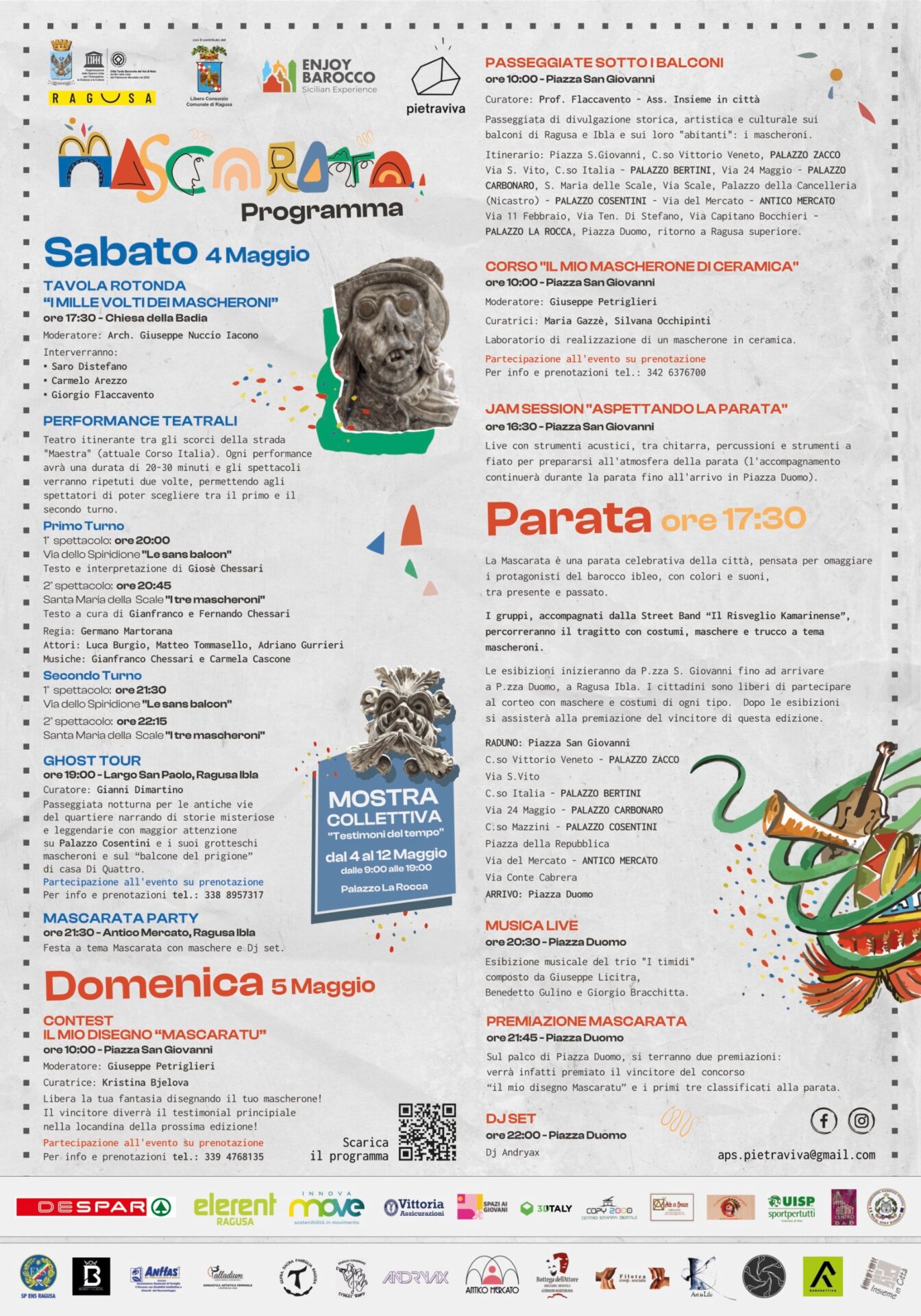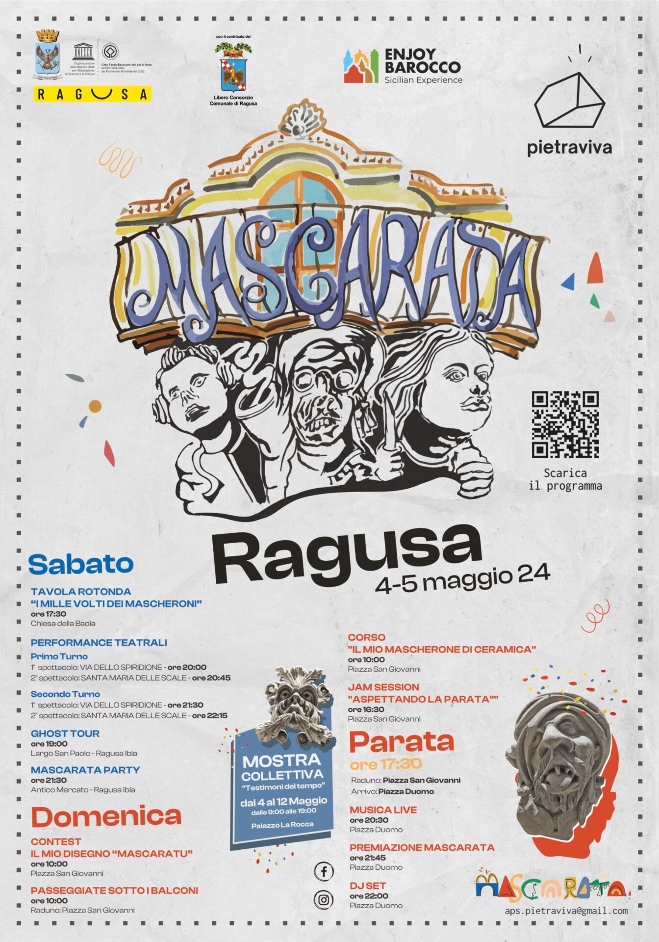 La fase artistica della Mascarata si manifesta attraverso una serie di eventi straordinari, tra cui la mostra collettiva “Testimoni del Tempo” presso Palazzo La Rocca, rappresentazioni teatrali itineranti dedicate ai mascheroni e due laboratori artistici. Questi eventi offriranno al pubblico l’opportunità di immergersi nell’arte e nella cultura di Ragusa, scoprendo nuove prospettive e interpretazioni dei mascheroni e del loro significato per la città.