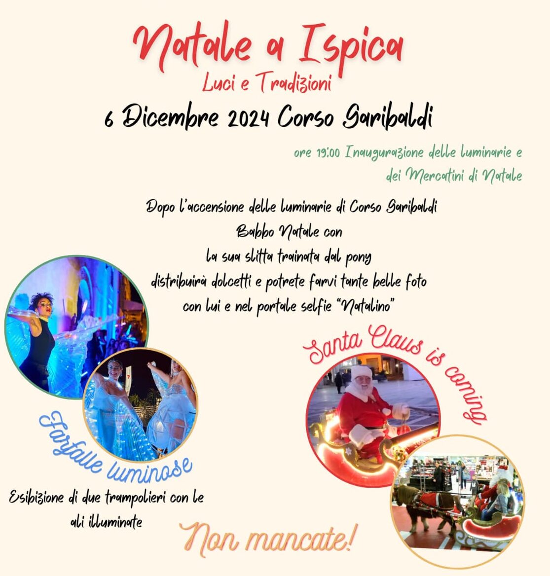 Natale a Ispica! ✨ Babbo Natale ti aspetta in Corso Garibaldi il 6 dicembre dalle 19:00 con dolcetti e tante foto ricordo! Non perdere l’accensione delle luminarie, i mercatini e lo spettacolo dei trampolieri luminosi!