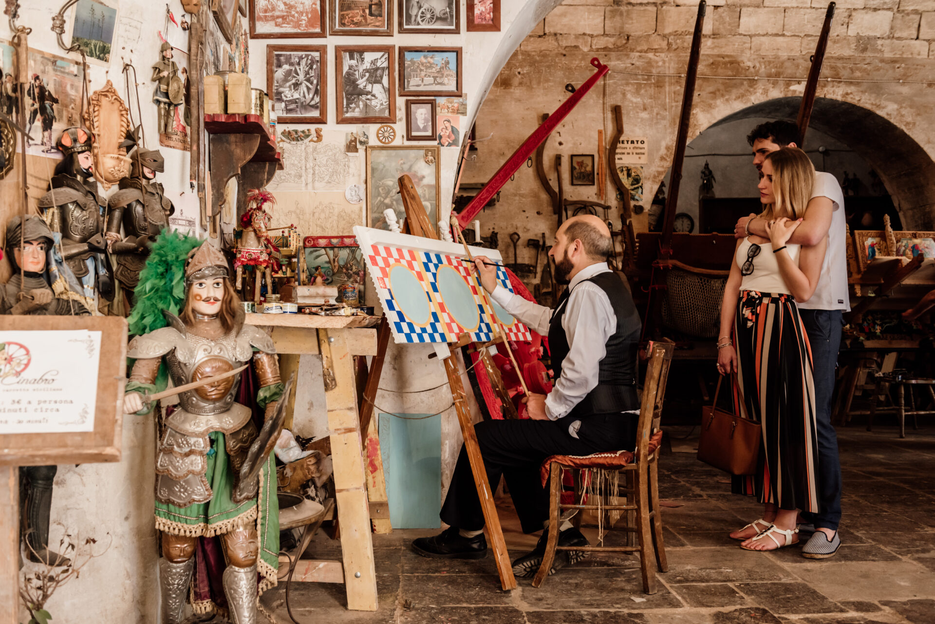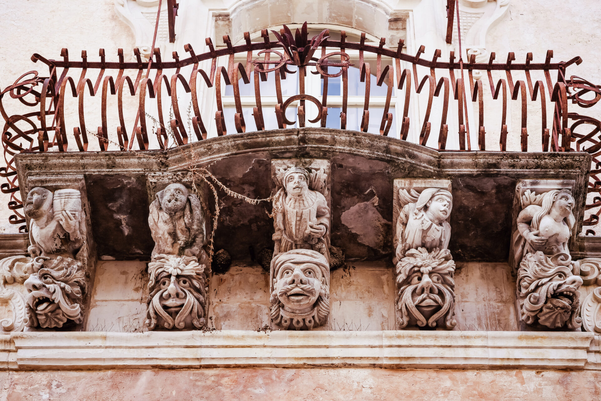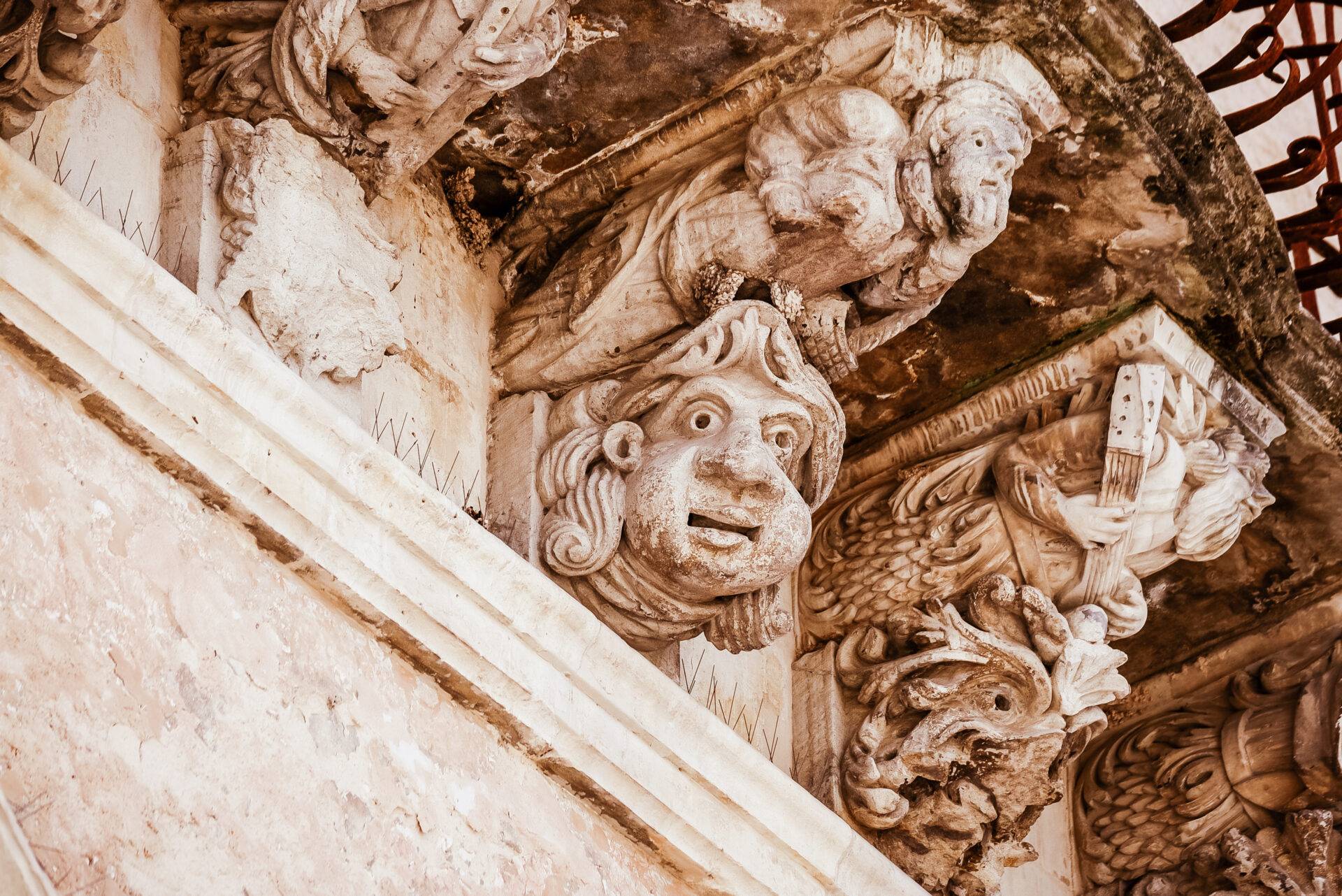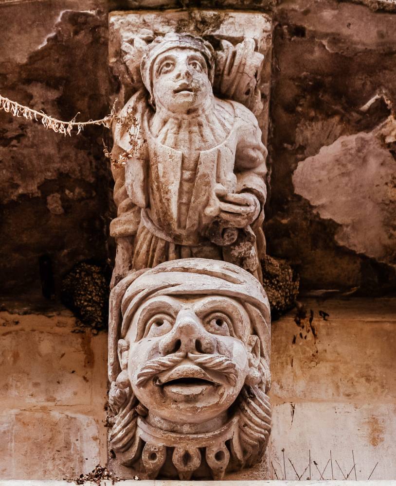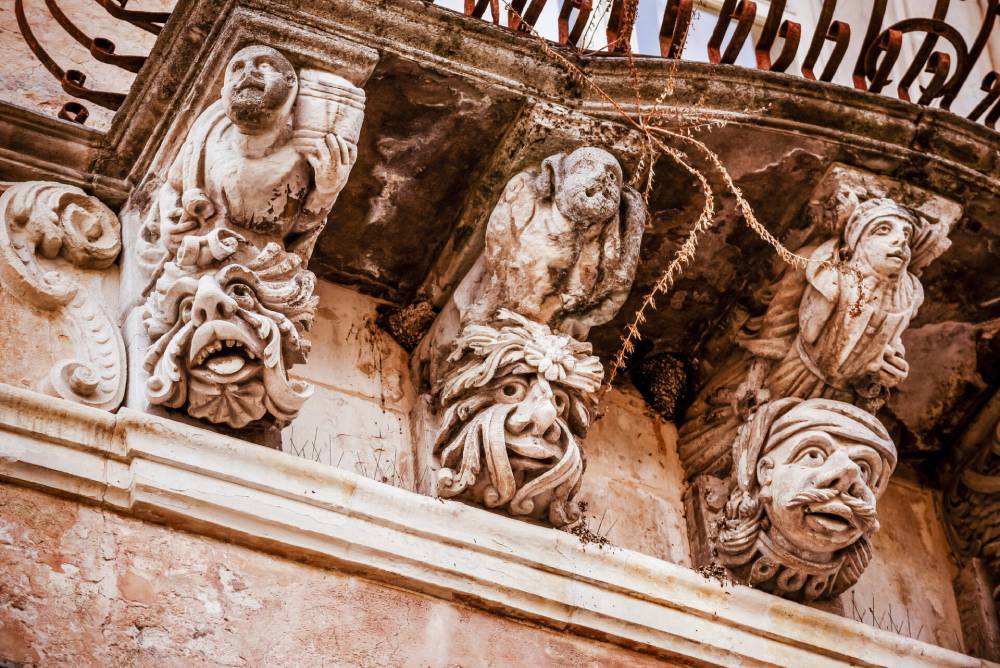 Lungo il percorso delle scale, su rampe e piccole piazze, si incontrano palazzi straordinari come la Vecchia Cancelleria (una volta sede del Comune di Ragusa), e palazzo Cosentini dai cui mensoloni si ammirano i mascheroni scolpiti in pietra locale che dall’alto scrutano il passaggio dei passanti. Per le strade di Ragusa, volti di santi, muse, mostri, animali che “osservano” con occhi attenti il cammino dei visitatori lungo le strade, i cortili e le viuzze della terra barocca.