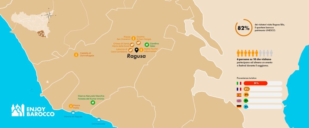 Ragusa mostra un patrimonio artistico e monumentale di grande pregio, interessanti appuntamenti culturali ed eventi di respiro nazionale. I suoi culti antichi conservano ancora oggi riti sacri e folkloristi come le feste patronali di San Giorgio e di San Giovanni e gli antichi riti della Settimana Santa. Stupendi punti panoramici permettono di godere della vista della città circondata dalla valle dell’Irminio, da quella di San Leonardo e dalla Vallata Santa Domenica.