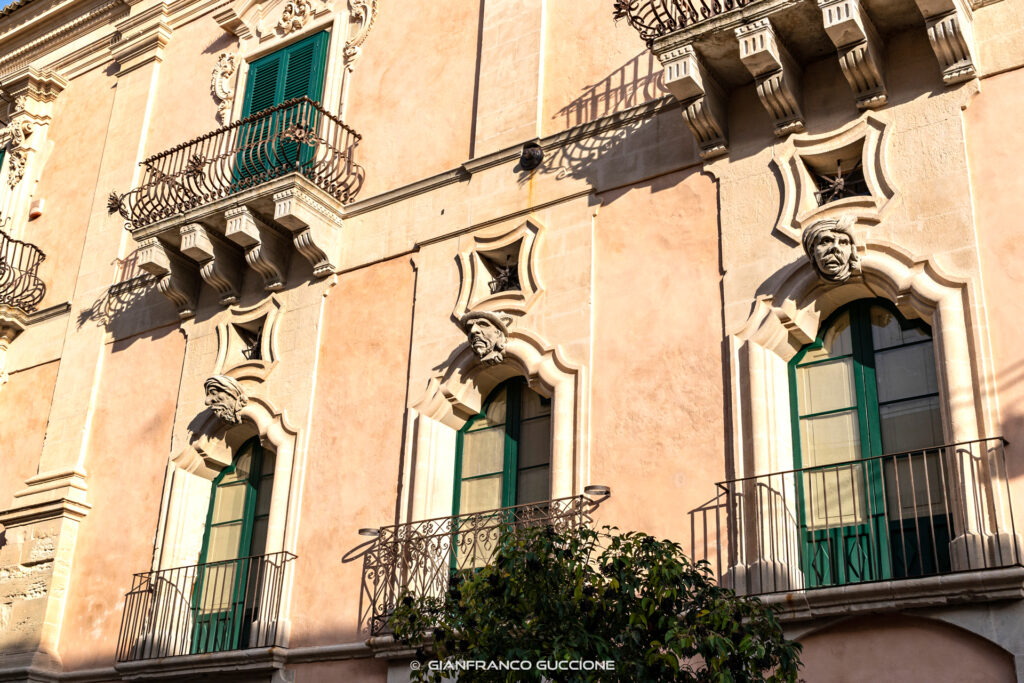 Il palazzo è uno dei capolavori barocchi della Sicilia. L’imponente prospetto colpisce per la magnificenza e per i grandi balconi retti da grotteschi mensoloni dove noterete rettili, musicisti, donne a seno nudo e traboccanti cornucopie simbolo di ricchezza e abbondanza.