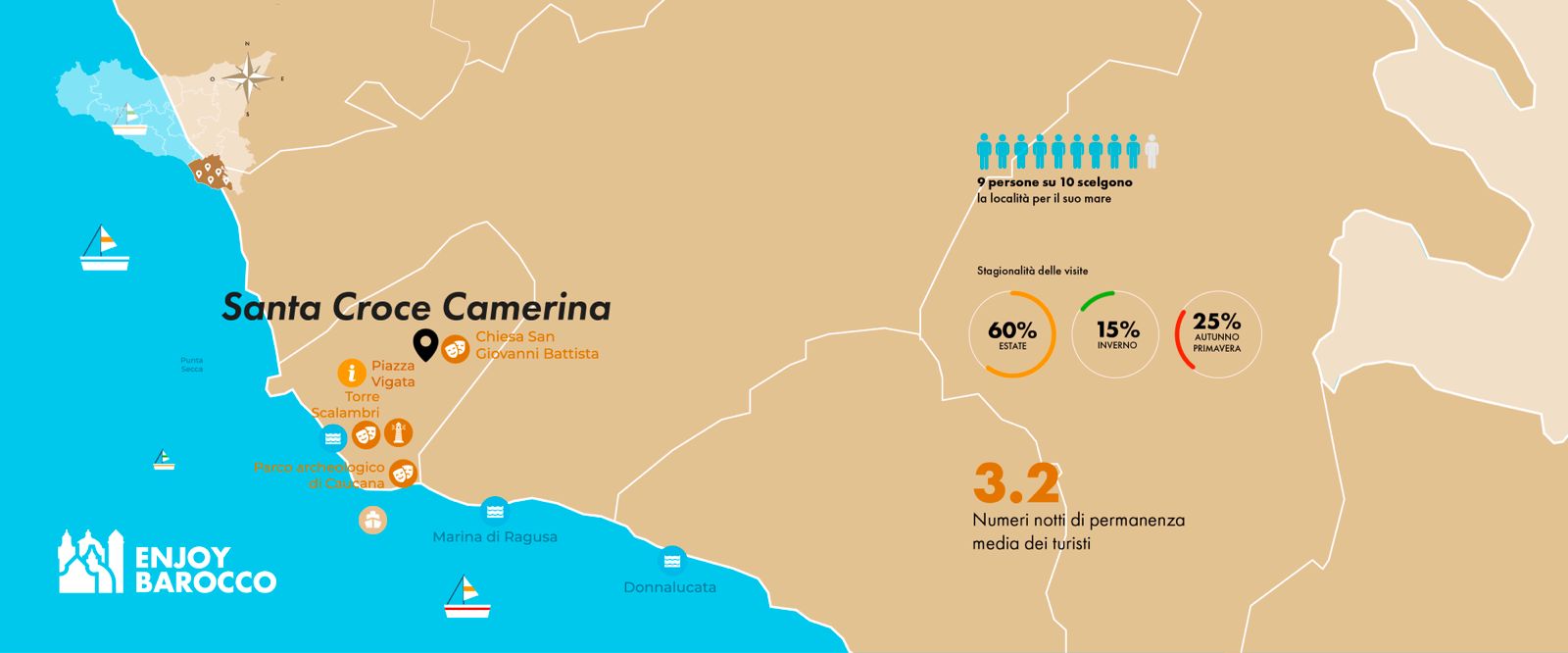 Santa Croce Camerina è un’importante meta per il turismo balneare grazie alle borgate di Casuzze, Caucana, Punta Braccetto, Torre di Mezzo e soprattutto Punta Secca. Quest’ultima è una località molto conosciuta e amata perché sulla spiaggia del borgo si trova la Casa di Montalbano, la villetta in cui è stata ambientata l’abitazione del commissario Salvo Montalbano. La casa è un frequentato b&b e grande attrazione per turisti da tutto il mondo.
