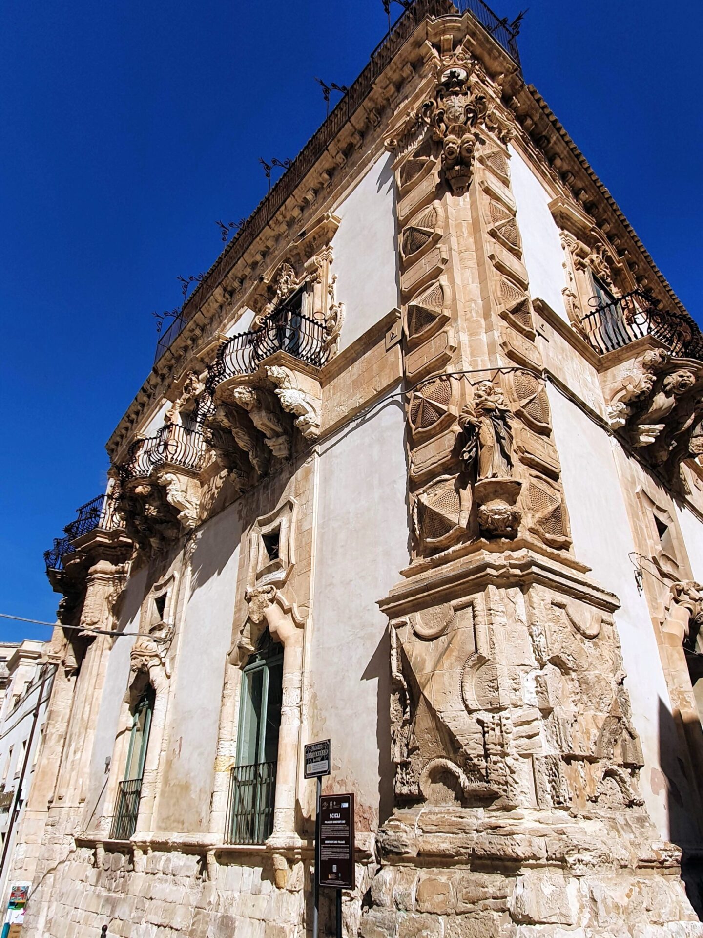 Il palazzo è uno dei più singolari edifici barocchi della Sicilia. Ha una particolare posizione d’angolo: il cantonale decorato con bugne che richiamano i diamanti, funge da cerniera tra le due facciate. I mascheroni irriverenti, i balconi scenografici, i mensoloni decorati, lo rendono unico nel suo genere.