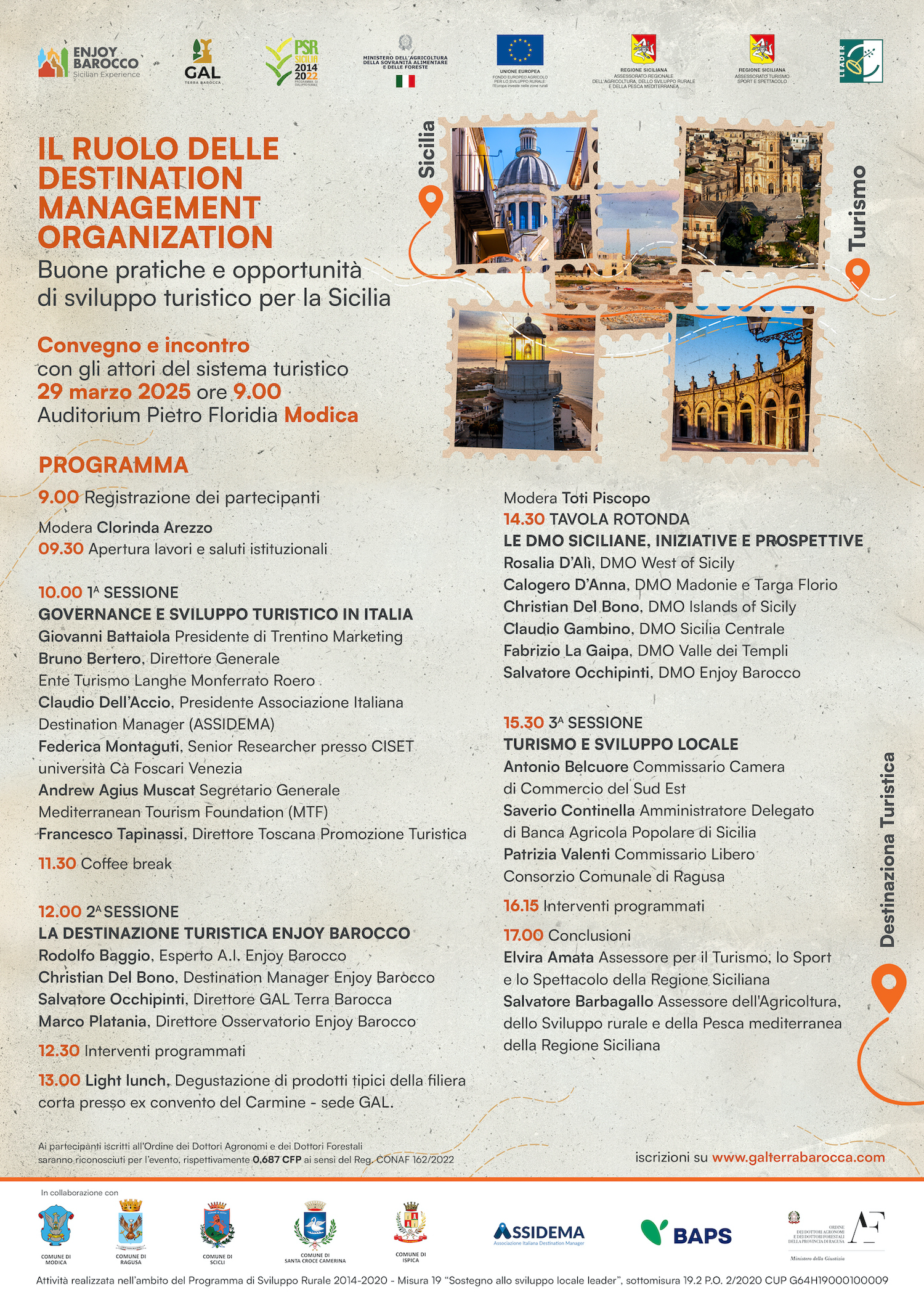 A concludere i lavori, gli interventi di due figure chiave dell’amministrazione regionale: Elvira Amata, assessore al Turismo, Sport e Spettacolo della Regione Siciliana, e Salvatore Barbagallo, assessore all’Agricoltura, Sviluppo Rurale e Pesca Mediterranea. “Le Destination Management Organization – spiega il presidente del GAL Terra Barocca, Maria Monisteri – si configurano oggi come strumenti essenziali per la valorizzazione e la promozione del territorio, in grado di coordinare attori pubblici e privati per la creazione di un’offerta turistica integrata e competitiva. Il convegno di Modica si pone l’obiettivo di esplorare le opportunità offerte da queste organizzazioni, analizzando modelli di governance, strategie di branding territoriale e l’impiego delle nuove tecnologie per la valorizzazione delle destinazioni”. Durante la giornata saranno protagonisti anche i tre progetti finanziati dal GAL Terra Barocca sui prodotti della filiera corta, testimonianza dell’attenzione crescente verso un turismo enogastronomico autentico e sostenibile, strettamente legato al territorio. Info e prenotazione obbligatoria sul sito www.galterrabarocca.com