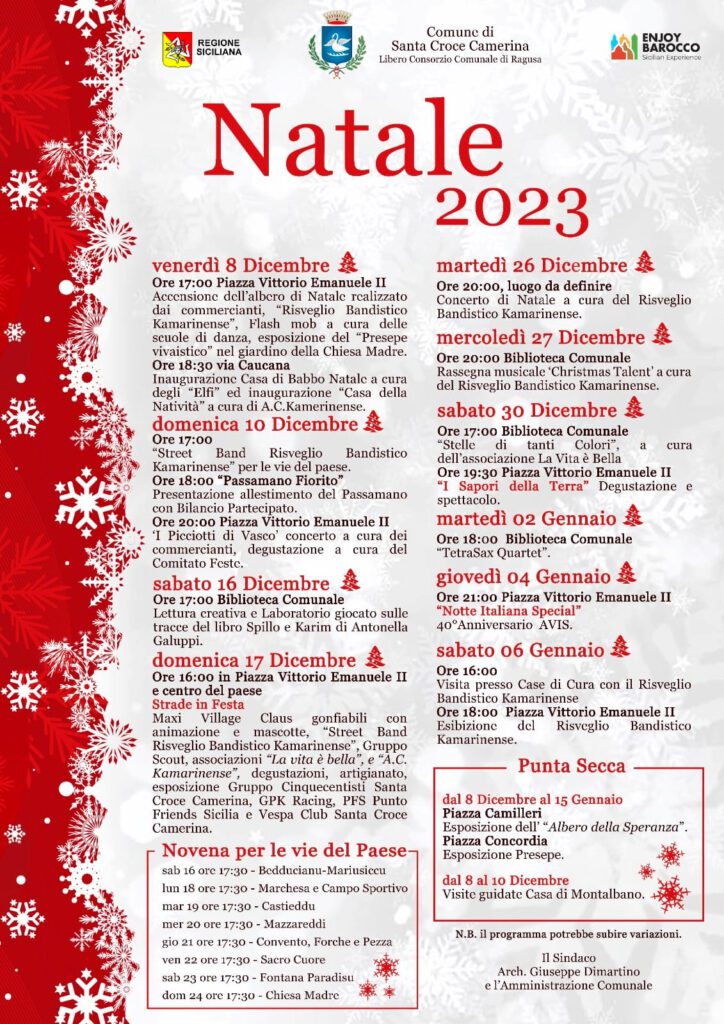 A Santa Croce Camerina sarà piazza Vittorio Emanuele con il suo grande albero di Natale il fulcro degli eventi natalizi in programma che comprendono animazione, cultura, musica e degustazioni. L’8 dicembre si dà il via agli eventi natalizi con l’accensione delle luci dell’albero, a seguire flash mob delle scuole di danza e la musica della banda “Risveglio bandistico Kamarinense”. Domenica 17 dicembre, grande festa con il maxi village Claus, con degustazioni, musica e divertimento per bambini con gonfiabili. Per più piccoli dall’8 dicembre è attiva in via Caucana la casa di Babbo Natale, a cura degli “Elfi”. Degustazioni “i sapori della terra” e spettacoli anche il 30 dicembre dalle 19.30.